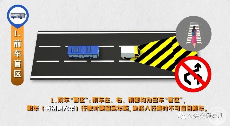 2、旁車“盲區(qū)”:同向車頭、對向車尾都是己車“盲區(qū)”,駕駛員要做到“同向超車當心車頭、對向會車當心車尾”,防范突然躥出橫穿馬路的行人。