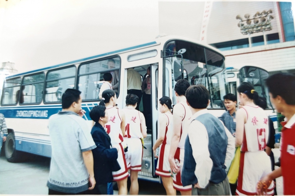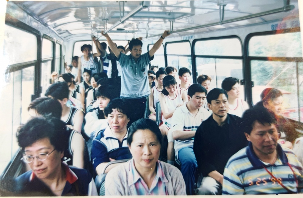 ▲1999年5月25日,沈陽電梯隊隊員、教練乘坐公交出行。公交車頭還掛有“荊門公交熱忱為女籃服務(wù)”橫幅。