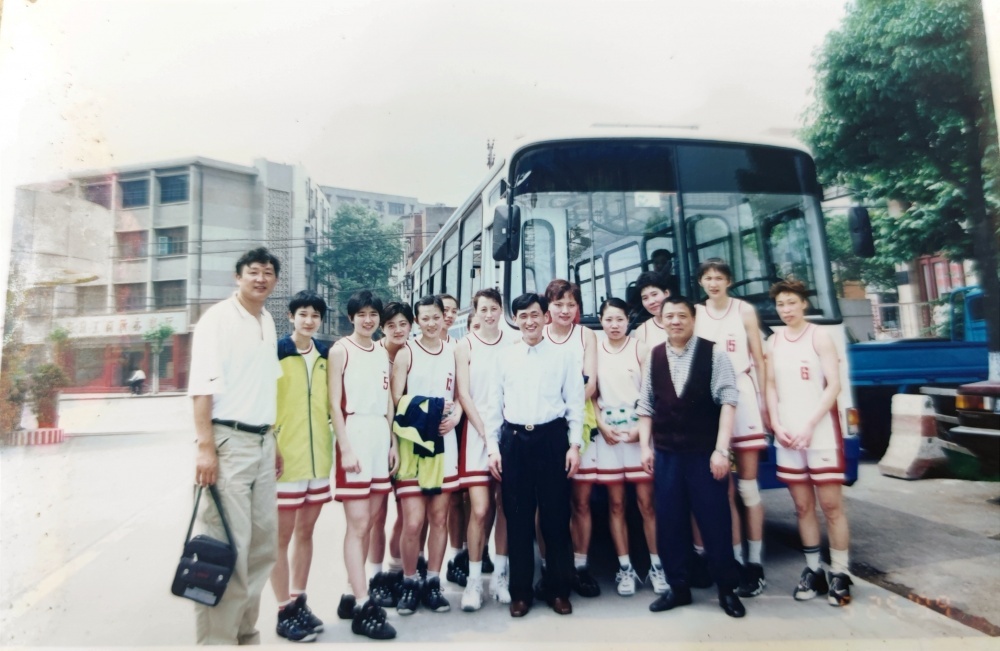 ▲1999年5月25日,沈陽電梯隊在公交車旁合影留戀。從“中國籃球大事記”查閱到,1999年全國女子籃球甲級聯(lián)賽,沈陽電梯隊奪得了當年聯(lián)賽冠軍。