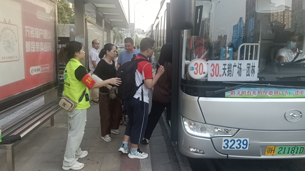 開(kāi)學(xué)當(dāng)天,人流大、車(chē)輛多,在城區(qū)各個(gè)學(xué)校附近,公交志愿者身穿綠馬甲或是佩戴安全袖章,守候在關(guān)鍵路口、站臺(tái)和斑馬線,面帶笑容引導(dǎo)學(xué)生安全出行。