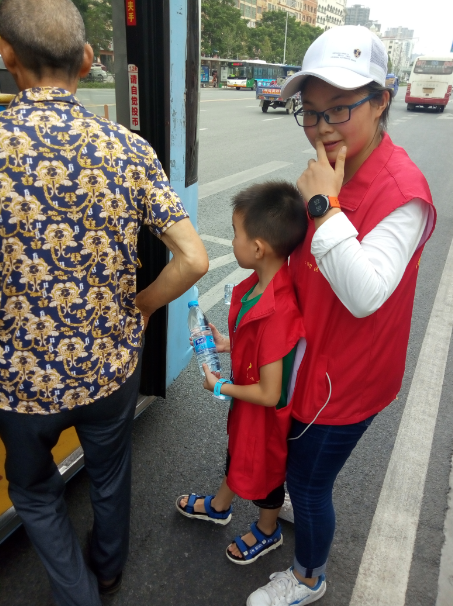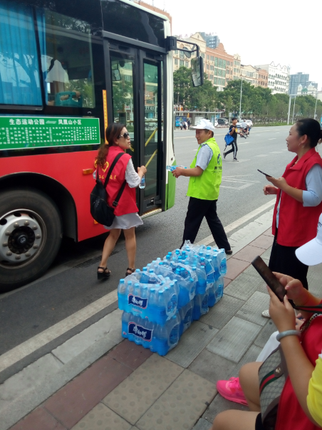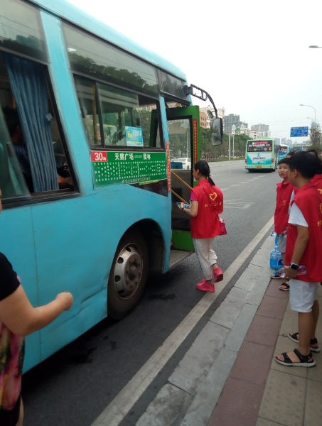 15時(shí)許,志愿者們已經(jīng)布置好了送水點(diǎn),將箱礦泉水?dāng)[在了站臺旁邊。每有一輛公交車進(jìn)站??浚驹刚邆兌紩o駕駛員們遞上兩瓶礦泉水,還有一些放暑假的小朋友們,也熱情的加入到此次活動,充當(dāng)著志愿主力軍,用他們的行動清涼了公交駕駛員的心,傳播著社會正能量。