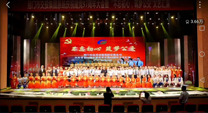 6月26日,市公共交通集團(tuán)有限公司在荊門(mén)劇院舉行慶祝建黨97周年表彰大會(huì)暨“不忘初心,筑夢(mèng)公交”文藝演出,來(lái)自11個(gè)基層單位員工獻(xiàn)出了一場(chǎng)炫目多彩的紅色文化視聽(tīng)盛宴。