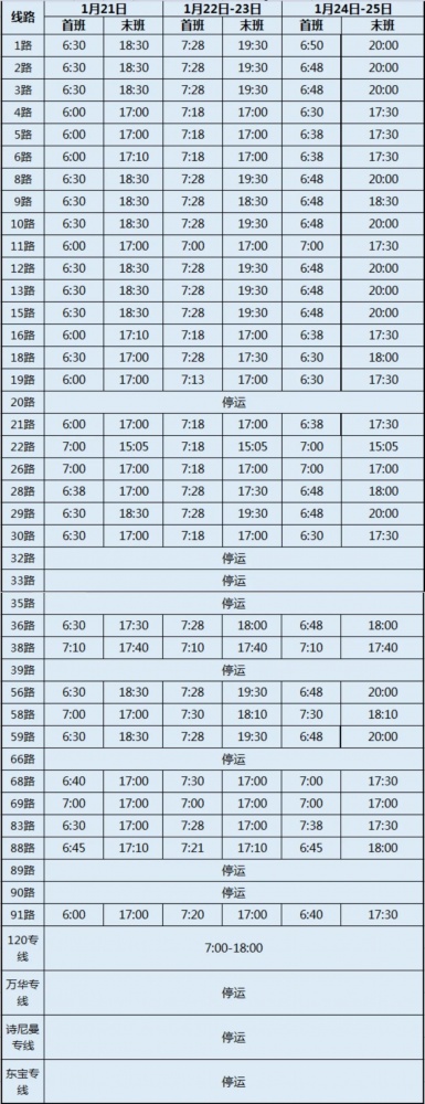 春節(jié)期間,市公交集團(tuán)公交線路營運(yùn)計(jì)劃有調(diào)整。2023年1月21日-1月25日(除夕至初四)各營運(yùn)線路相較平常在首末班次、發(fā)班間隔上有所變化,為方便廣大市民春節(jié)前后出行,現(xiàn)將春節(jié)期間公交營運(yùn)安排通告如下: