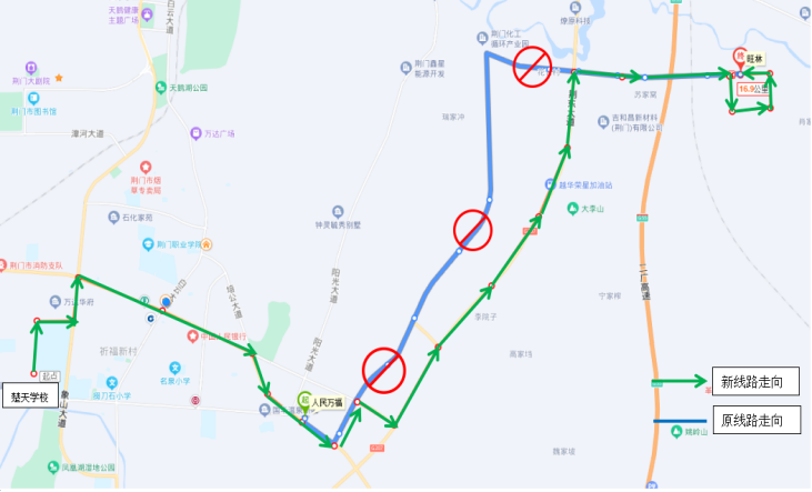 一.優(yōu)化調整33路公交線路走向 ◆首末站:楚天學?!郑ㄐ】的下繁保?/p> ◆首末班時間:6:50—17:45 ◆線路走向:響嶺路—運動公園路—象山大道—深圳大道—培公大道—荊和大道—深圳大道—荊東大道—興化三路—格林北路—興化四路—小康南路 ◆??空军c:楚天學校、雙喜街辦、運動公園路、萬達廣場、掇刀檢察院、掇刀法院、掇刀公安分局、南城明珠、中國人民銀行、市氣象局、襄荊高速、雙泉社區(qū)、人民萬福商貿(mào)城、人民一品花園、虎頭山、殯儀館、馮廟村、固潤科技、東方雨虹、圣通石化、荊東消防、荊東大道興化五路口、潤都制藥、興化三路西、興化三路中、興化三路盈德氣體、紐蘇萊、旺林、興化四路、小康南路北。 ◆取消原33路途經(jīng)荊和大道等路段站點:荊和大道南、陽光五路、陽光四路、陽光三路、化工產(chǎn)業(yè)園行政大樓。 二.優(yōu)化調整69路公交發(fā)班時間 ◆調整前 園博園東門發(fā)班時間:6:40、7:40、15:30、16:30、17:15 玲瓏輪胎發(fā)班時間:7:30、8:30、16:30、17:30、18:00 ◆調整后 園博園東門發(fā)班時間:6:40、7:20、15:30、16:30 玲瓏輪胎發(fā)班時間:7:30、8:20、12:20、16:20、17:30